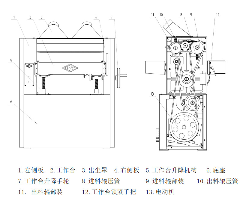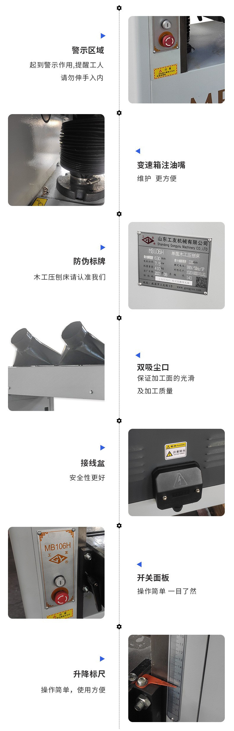 該機床送料平穩(wěn),前壓輥采用分段活動結構,可同時送入厚度相差2毫米以內的多塊材料;前后壓料器調節(jié)方便,可加工薄板;工作臺升降裝置結構合理,操作平穩(wěn)輕便;獨特的主軸結構,保證良好的加工質量。該機具有兩級送料速度,可滿足不同加工工件的要求。